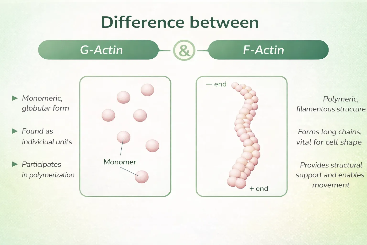 - G-actina (actina globular) es una forma monomérica (única) de actina que puede moverse rápidamente a los sitios de daño/crecimiento y se utiliza para la construcción de tejidos.
